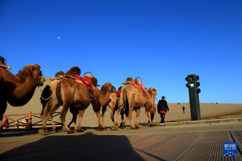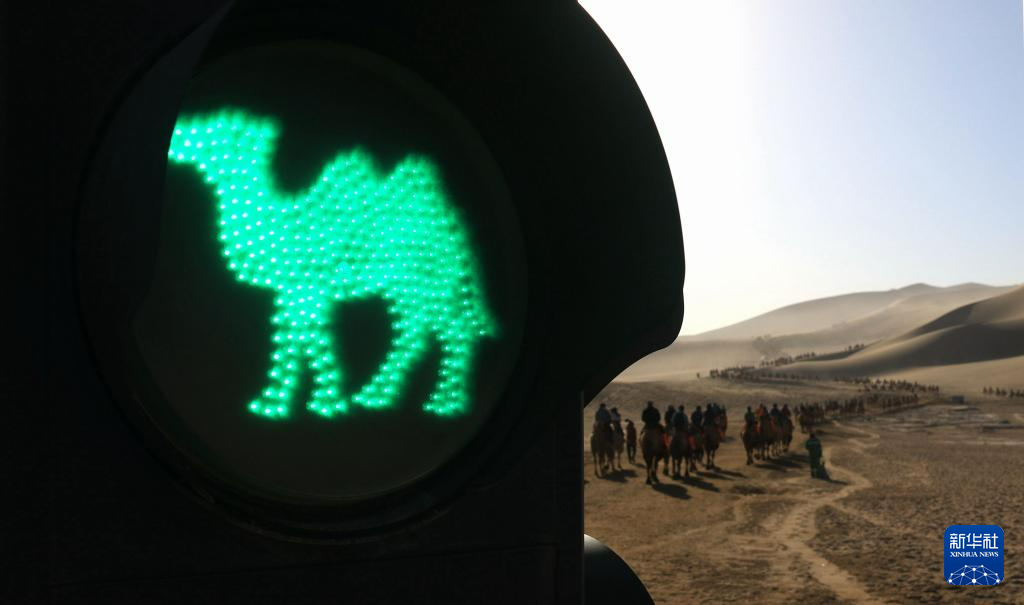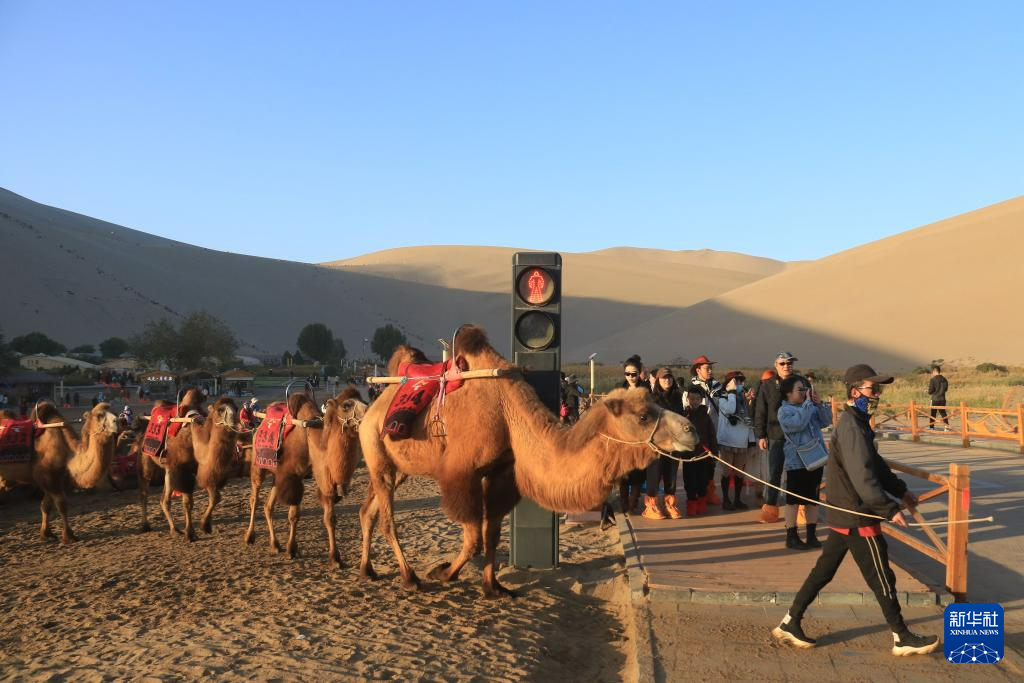 10月2日,甘肃省敦煌市鸣沙山月牙泉景区的交通信号灯“骆驼绿灯”亮时,农户牵着骆驼有序通过。新华社发(张晓亮 摄)
