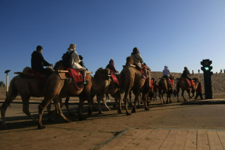 10月2日,游客在甘肃省敦煌市鸣沙山月牙泉景区体验骑骆驼。新华社发(张晓亮 摄)