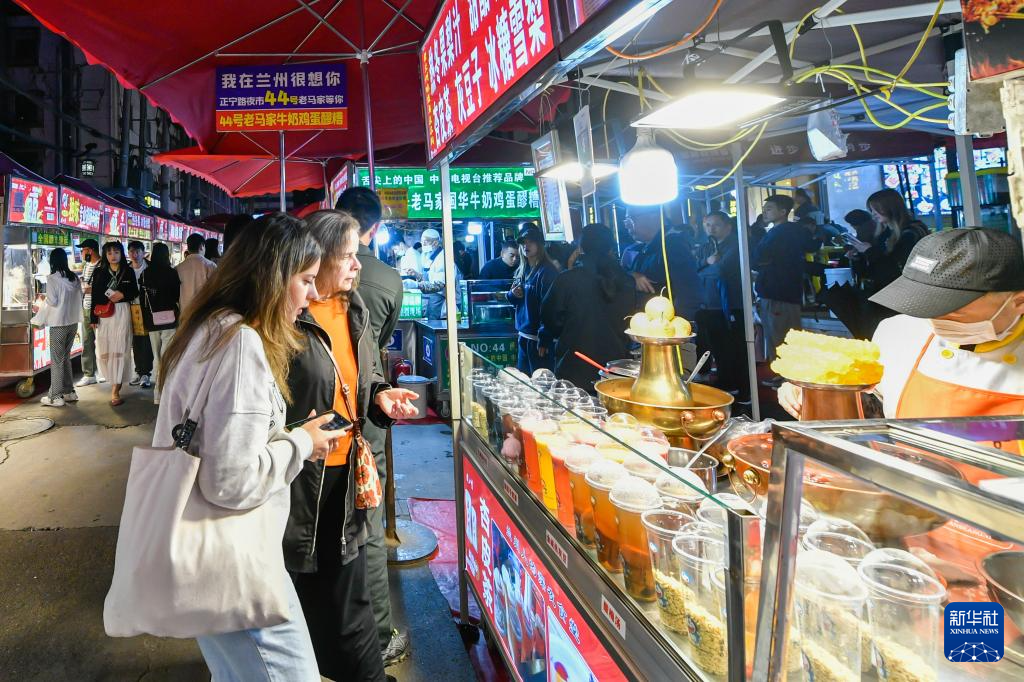 4月28日,游客在兰州市城关区正宁路小吃夜市选购特色美食。新华社记者 郎兵兵 摄