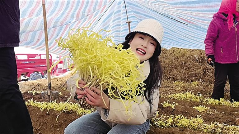 卷曲的韭黄刚露出泥土,热气从土地里氤氲,大家齐声喊道“丰收啦!”笑容挂在脸上,久久未消散。