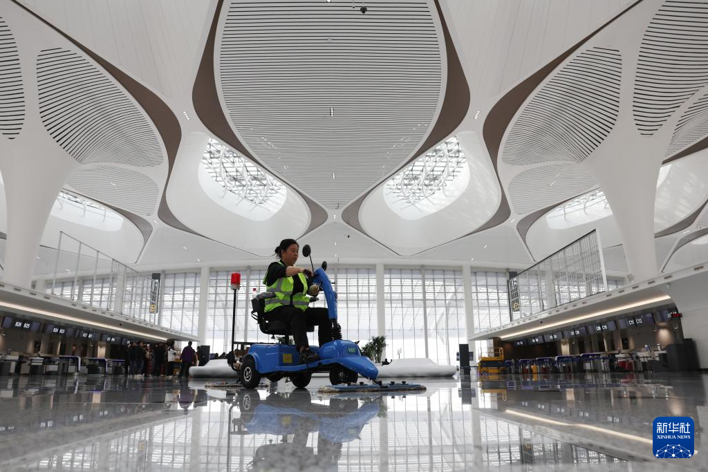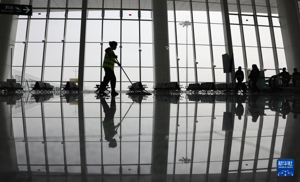 3月11日,保洁人员在兰州中川国际机场T3航站楼出发大厅进行保洁工作。新华社记者 陈斌 摄