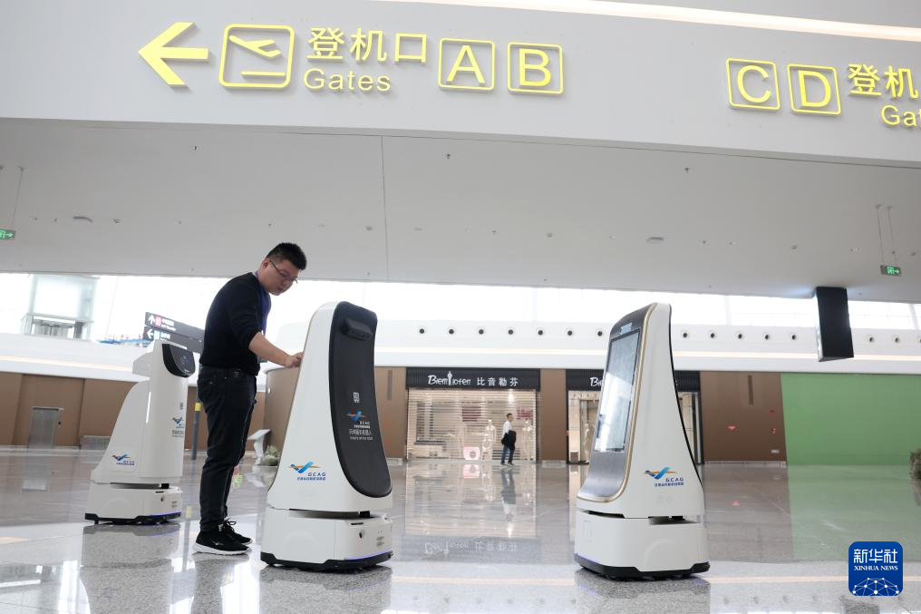 3月11日,技术人员在兰州中川国际机场T3航站楼候机区域对机器人进行调试检查。新华社记者 陈斌 摄