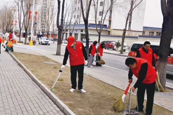 在县城姚川路,身着红马甲的志愿者和群众或清扫道路、或清理沟渠、或修剪绿化带中的枯枝败叶,并劝导过往群众参与其中。