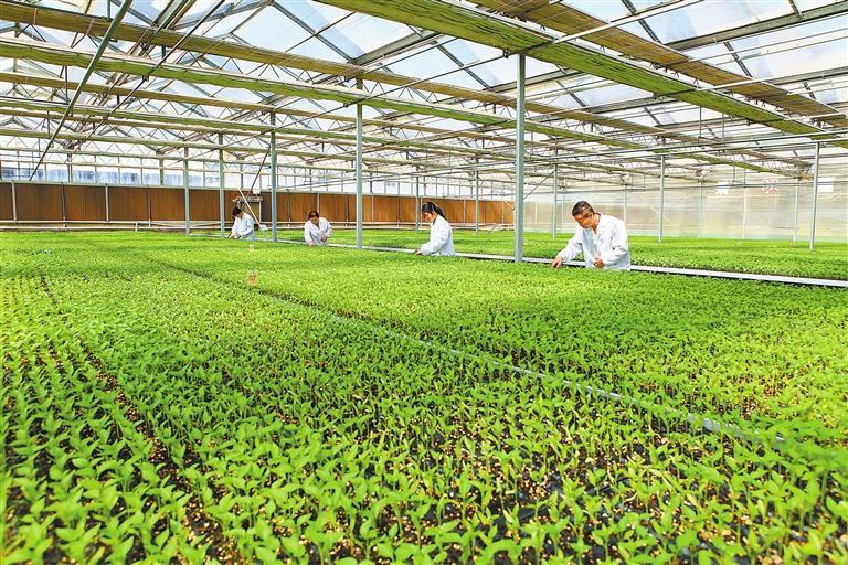 近日,嘉峪关宝能农业科技有限责任公司工作人员查看辣椒苗长势。新甘肃·甘肃日报通讯员 马玉福