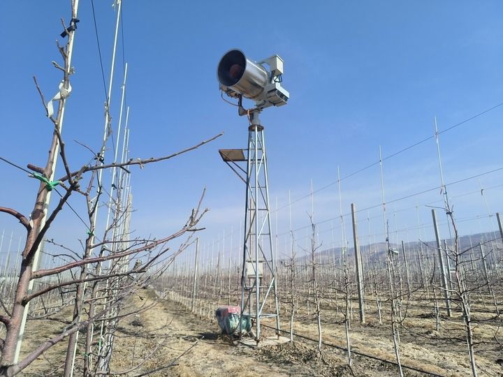 图为布设在甘肃省平凉市静宁县治平镇胡家塬现代苹果产业园内的防霜机。(新华社记者王紫轩 摄)