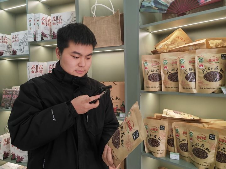 袁启力在店铺内检查花椒产品。(新华每日电讯记者崔翰超 摄)
