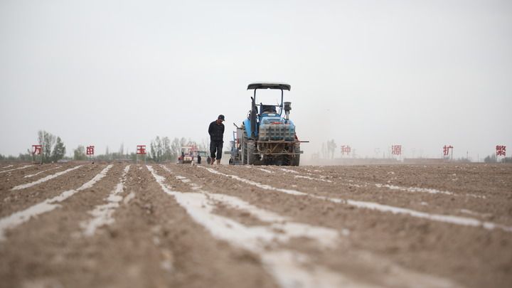 制种玉米进入春播期,工人在五个墩村播种。新华社记者张睿 摄