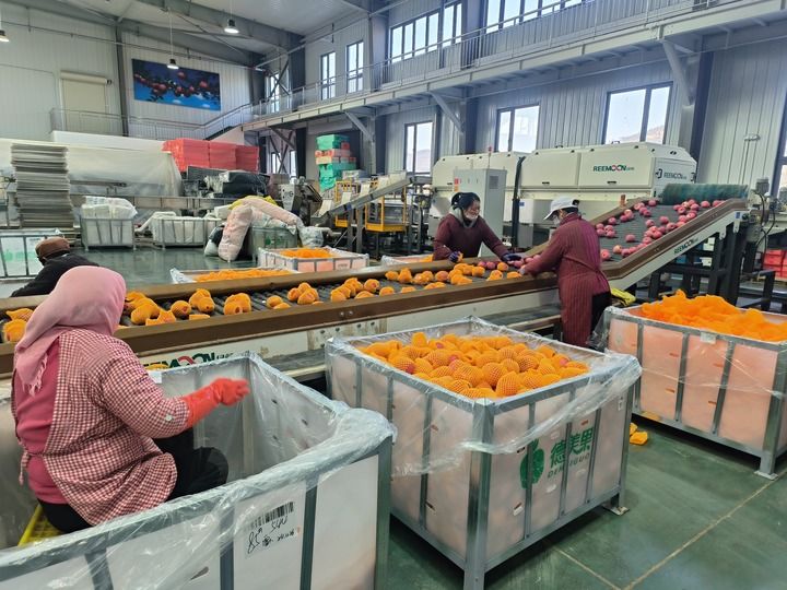 在位于甘肃德美地缘现代农业集团有限公司的苹果标准化分选中心,工作人员为自动分拣好的苹果套袋。(新华社记者刁慧琳 摄)