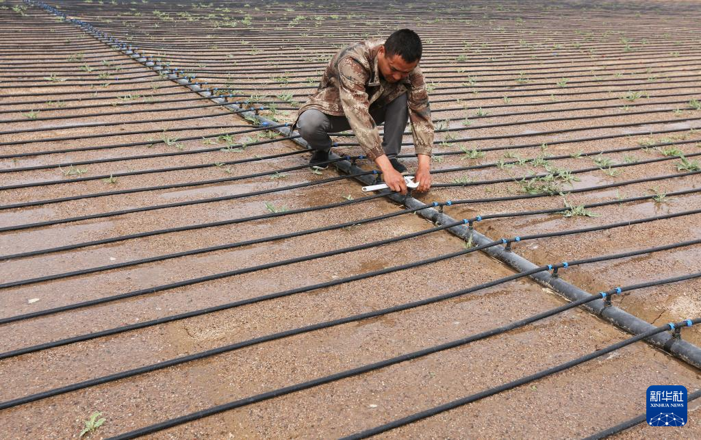 5月27日,甘肃省定西市安定区鲁家沟镇太平村农民在维护滴灌管道。新华社发(王克贤 摄)