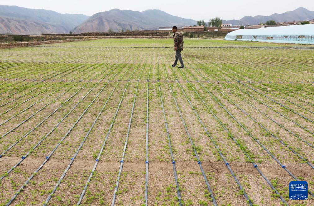 5月27日,甘肃省定西市安定区鲁家沟镇太平村农民在查看滴灌管道和蔬菜长势。新华社发(王克贤 摄)