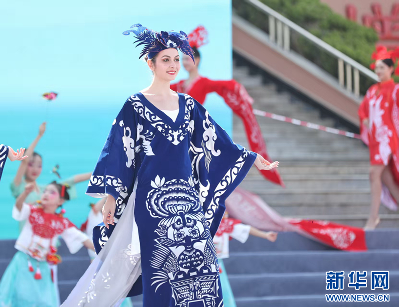 图为外国模特身着具有庆阳剪纸艺术元素的服饰表演。