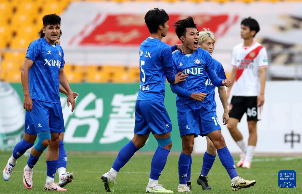 6月28日,兰州陇原竞技队球员梅景轩在比赛中庆祝得分。新华社记者 陈斌 摄