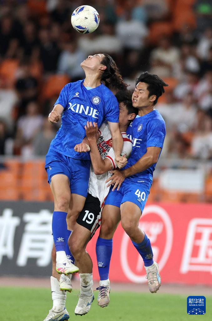 6月28日,无锡吴钩队球员张达驰(左)、刘至郅(右)与兰州陇原竞技队球员陈子桐在比赛中争顶。新华社记者 陈斌 摄