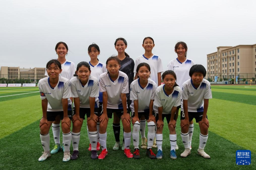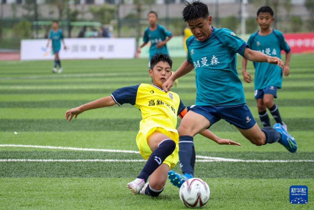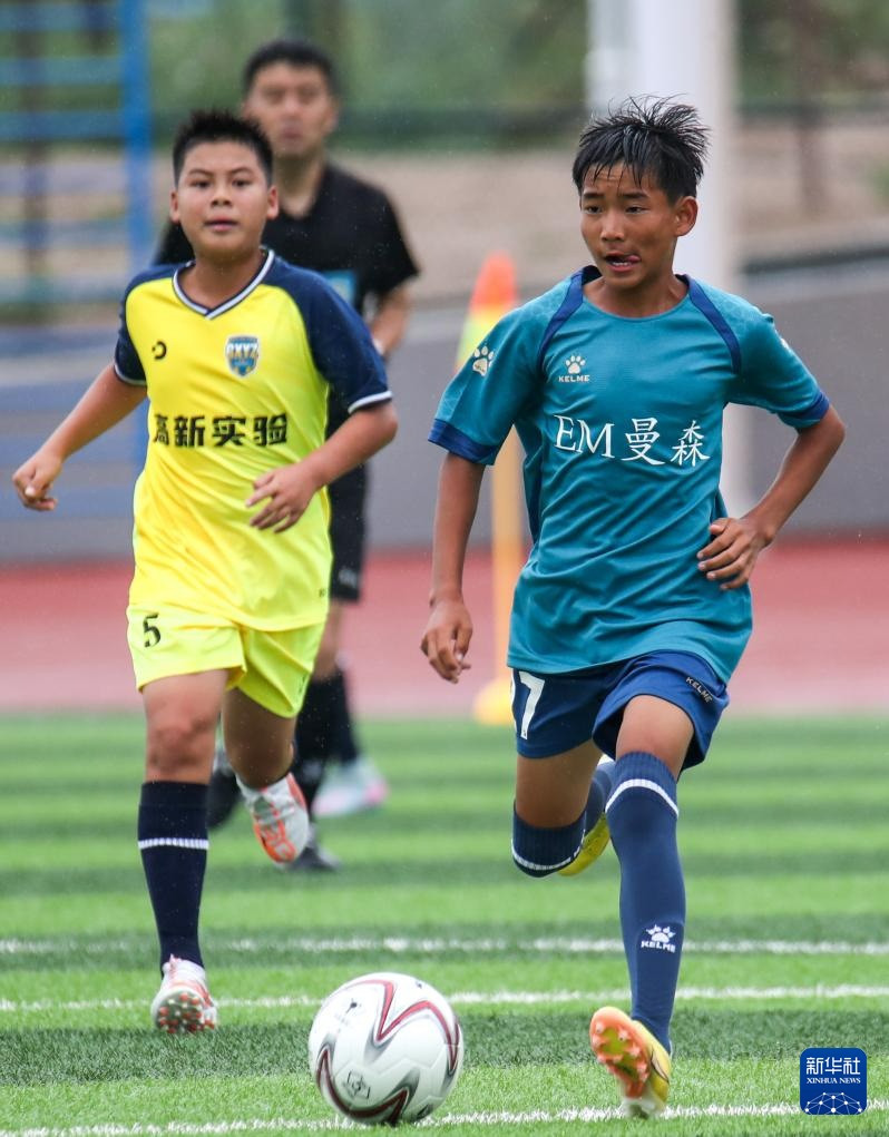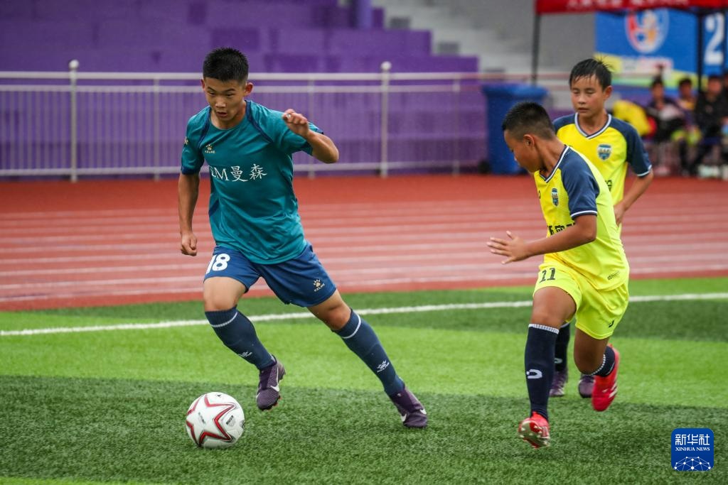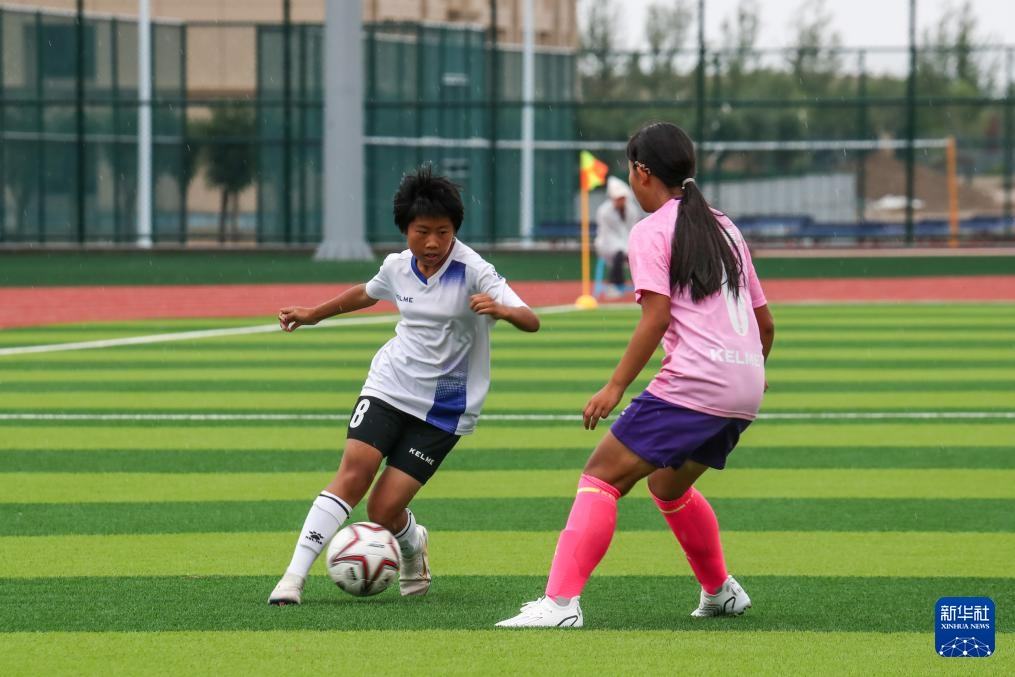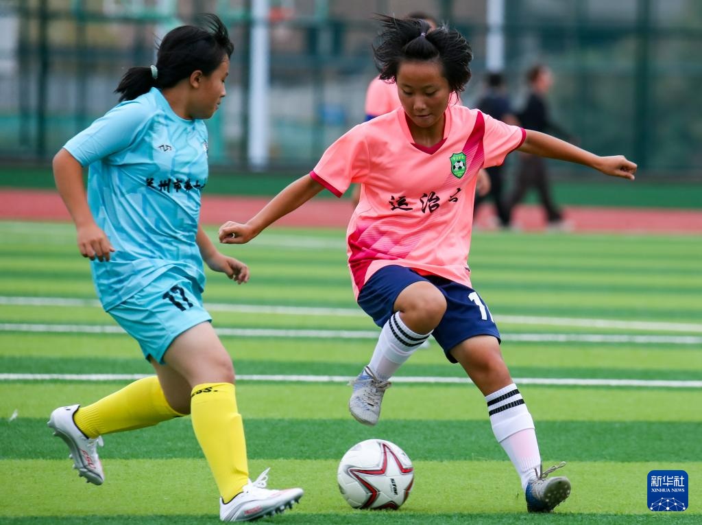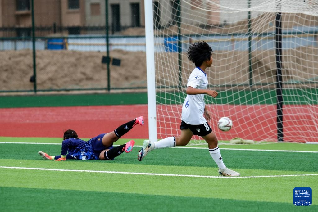 8月4日,内蒙古自治区代表队球员杜炎书(右)在U13女子组比赛中进球。新华社记者 郎兵兵 摄