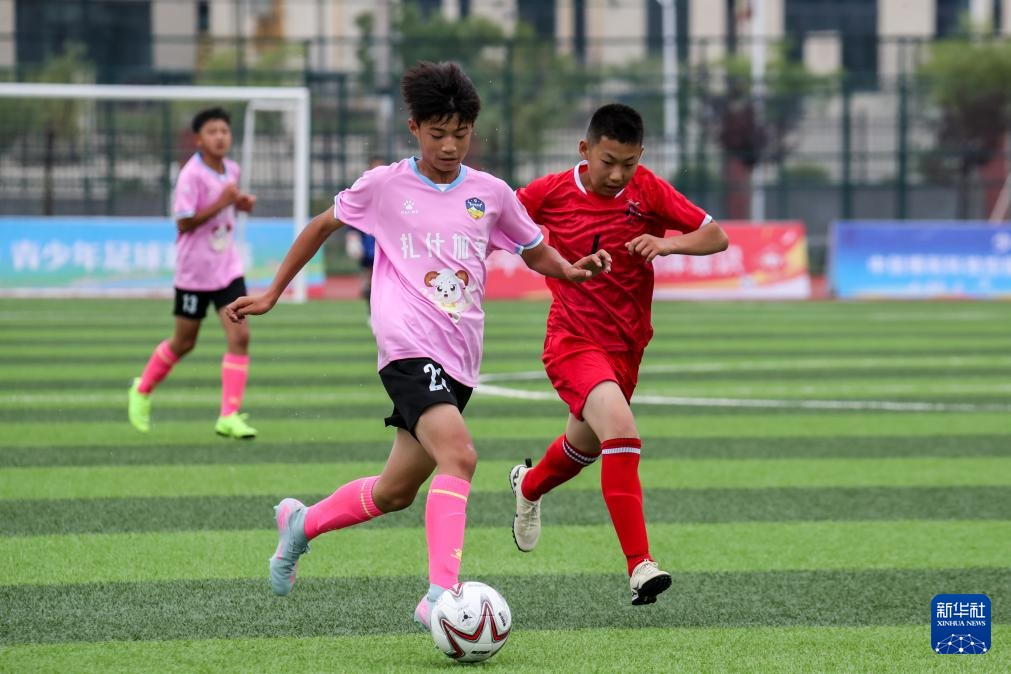 8月4日,青海曲麻莱克瑞斯代表队球员多杰然丁(右)在U13男子组比赛中带球突破。新华社记者 郎兵兵 摄