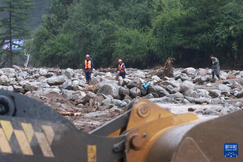 8月8日,救援人员在榆中县马坡乡山洪灾害现场排查险情,引导救援车辆进入。新华社发(金万贵摄)