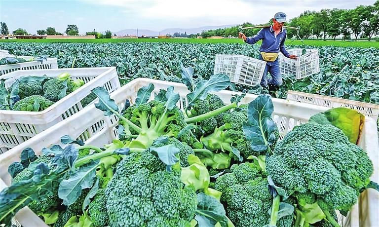 连日来,甘州区党寨镇马站村万亩有机蔬菜基地内,西蓝花、娃娃菜等绿色蔬菜正在采收。冷库车间,一箱箱打包好的蔬菜被陆续发往南方市场。
