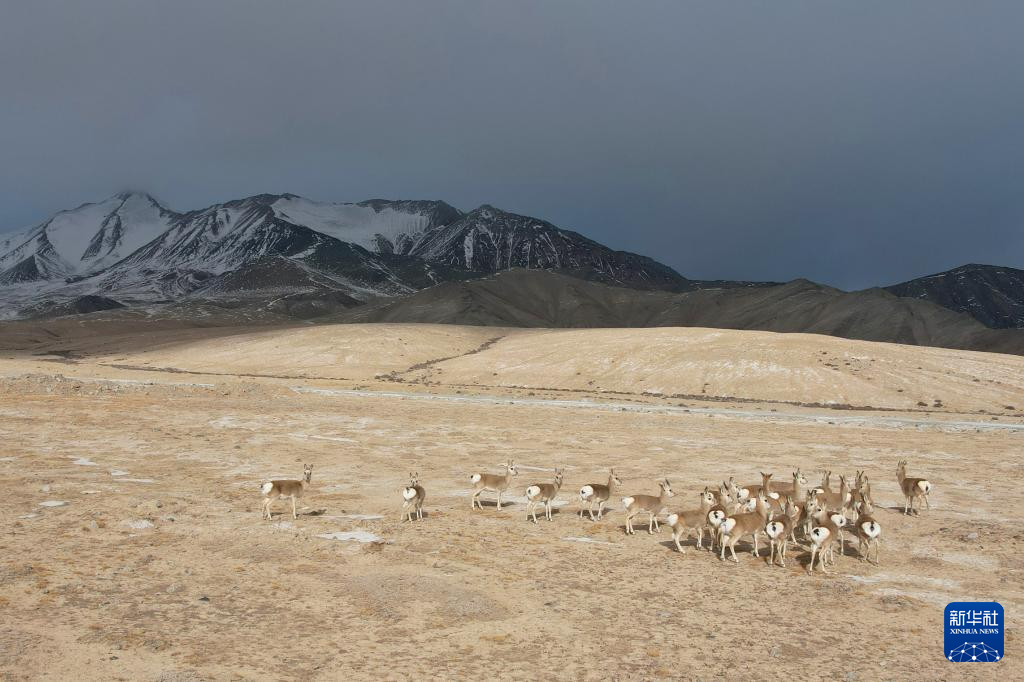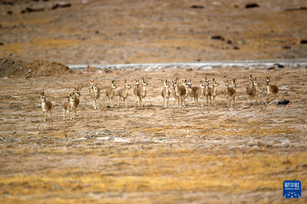 11月14日,国家二级保护野生动物藏原羚在甘肃省阿克塞县阿勒腾乡哈尔腾草原活动觅食(无人机照片)。新华社记者 张智敏 摄