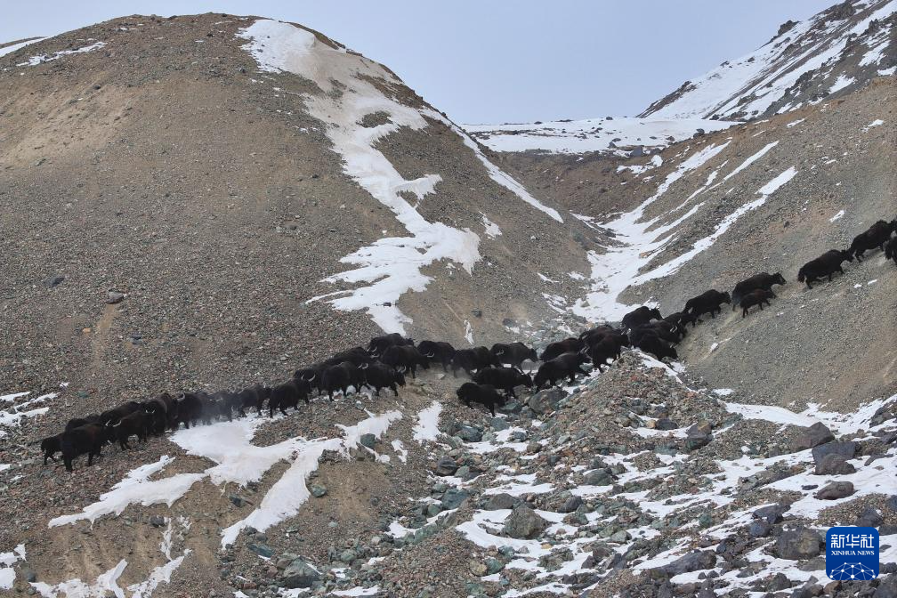 11月14日,国家一级保护野生动物野牦牛在甘肃省阿克塞县阿勒腾乡哈尔腾草原的雪山上转场迁徙(无人机照片)。新华社记者 张智敏 摄