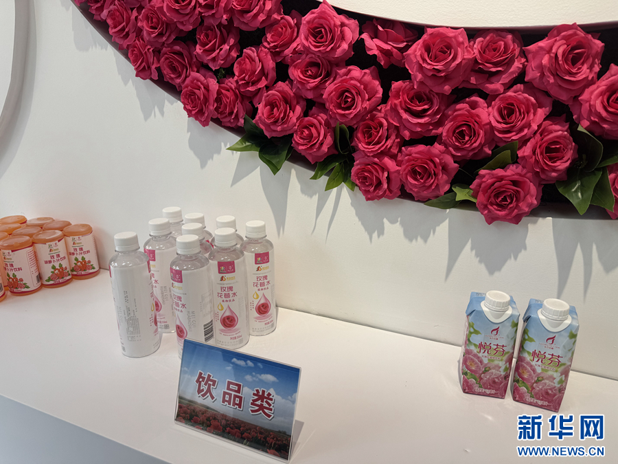 这是在苦水玫瑰文创基地里拍摄的玫瑰饮品类产品。新华网发(刘欣瑜 摄)