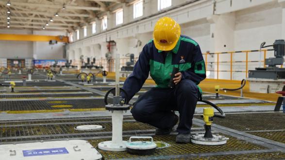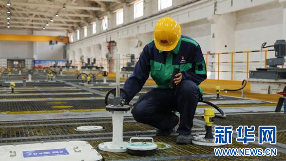 图为工作人员在调节萃取箱有机相高度。新华网(刘欣瑜 摄)