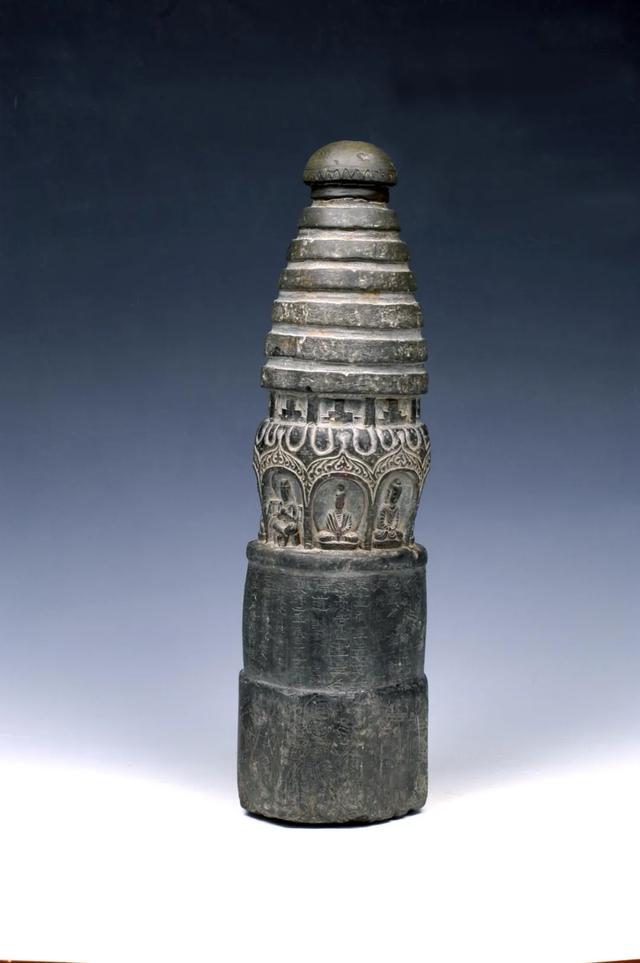 高善穆石造像塔(北凉),于酒泉市石佛湾子出土,塔高44.6厘米,底径15.2厘米。黑色砂页岩质,基座已佚。基座之上为八面形的塔基,刻出供养菩萨八身,七身立式,一身端坐莲台,各像左侧上角刻八卦符号。塔基上为圆柱覆钵形塔身,上刻隶书发愿文与经文36行,内容是《增一阿含经·结禁果》中的一段,纪年为承玄元年(428年)。上顶瓶形覆钵,覆钵开八个圆形龛,七个龛内刻禅定坐佛,一龛内雕交脚弥勒。覆钵之上有七重相轮,顶端宝盖象征天穹,阴刻北斗七星。