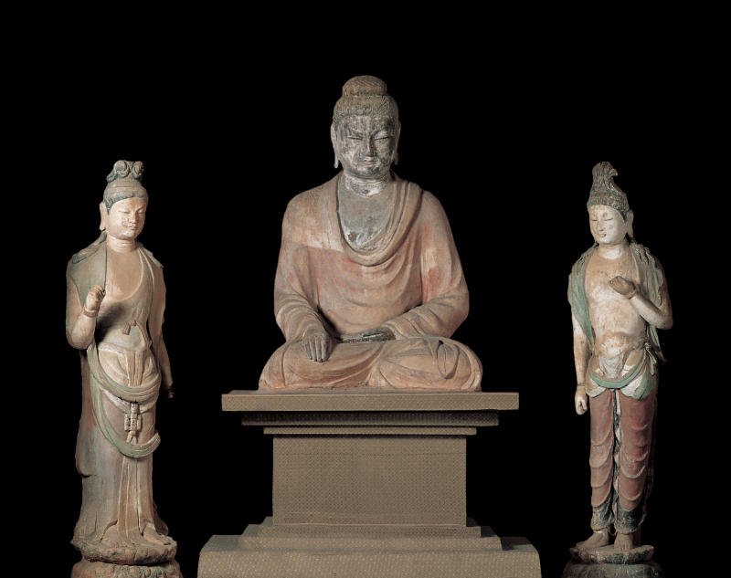 彩塑坐佛与胁侍菩萨(唐代),出土于武威市天梯山石窟,现藏于甘肃省博物馆。坐佛高130厘米,全跌坐,圆髻广颐,长眉细目,嘴唇紧闭,右手扶膝,左手施禅定印。身着通肩式袈裟,衣纹梯形折出。沉思的神情,雍容的体态,流畅的衣线,表现出恬静的心境。彩绘虽已斑驳,但不掩盛唐时期佛像圣洁安详的神韵,同窟中的菩萨立像,身姿优雅,气度端正。左侧胁侍菩萨高183厘米。头挽垂环髻,发绺披肩,面庞圆丰,秀目微睁,神情超脱中又露严正。体着紧身束带天衣及贴腿长裙帔巾自肩部横垂两道于膝下,右臂曲举,左臂下垂。右侧胁侍菩萨高180厘米。发髻耸起,余发成三绺垂肩,曲眉丰颐,神情恬静,庄严而不失妩媚。左臂曲至胸前,右臂下垂。宽披帛自双肩垂落至腋下,羊肠裙层折贴腿,柔和的线条完全同丰肌秀骨的身姿相应合。