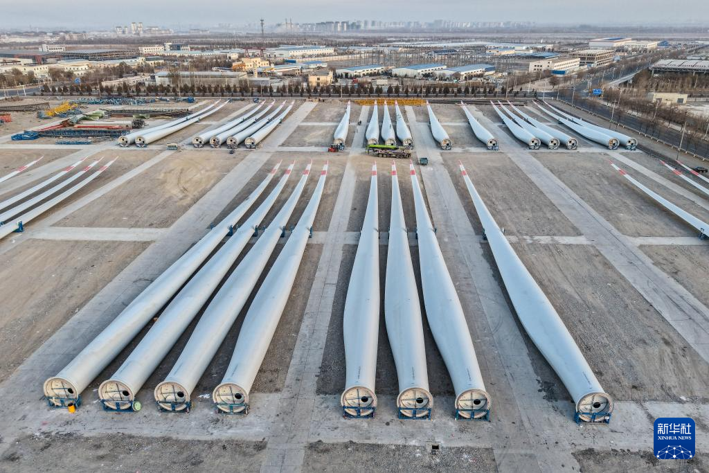 11月20日,在甘肃省酒泉经济技术开发区一家风电装备生产企业拍摄的风机叶片成品(无人机照片)。新华社记者 郎兵兵 摄