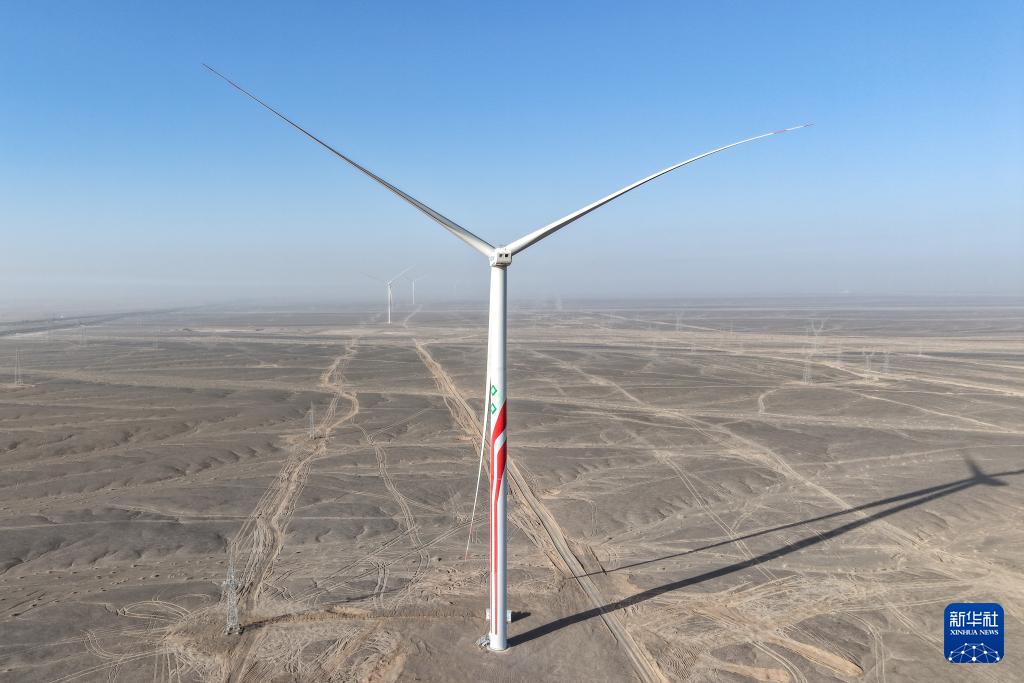 这是11月19日在甘肃省酒泉市瓜州县戈壁滩上拍摄的一台风机(无人机照片)。新华社记者 郎兵兵 摄
