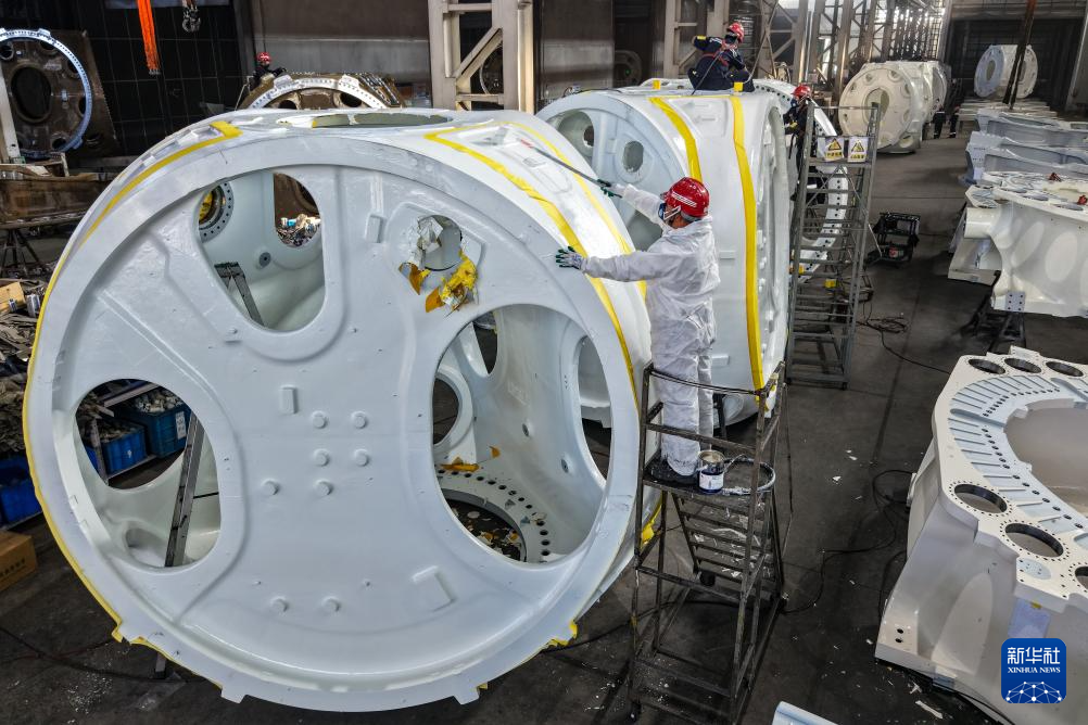 11月20日,在甘肃省酒泉经济技术开发区的甘肃九鼎风电复合材料有限公司,工作人员进行风机叶片轮毂试装作业。新华社记者 郎兵兵 摄