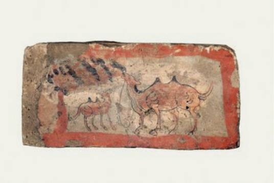“双驼图”壁画砖为魏晋时期墓葬文物,出土于甘肃省嘉峪关市魏晋1号墓,现藏于甘肃省博物馆。该壁画砖呈长方形,长35.5厘米,宽16.7厘米,厚5厘米。砖面中央绘大小两只骆驼,左侧绘有大树一棵。大骆驼呈昂首伸颈姿态,作啃食树叶状。