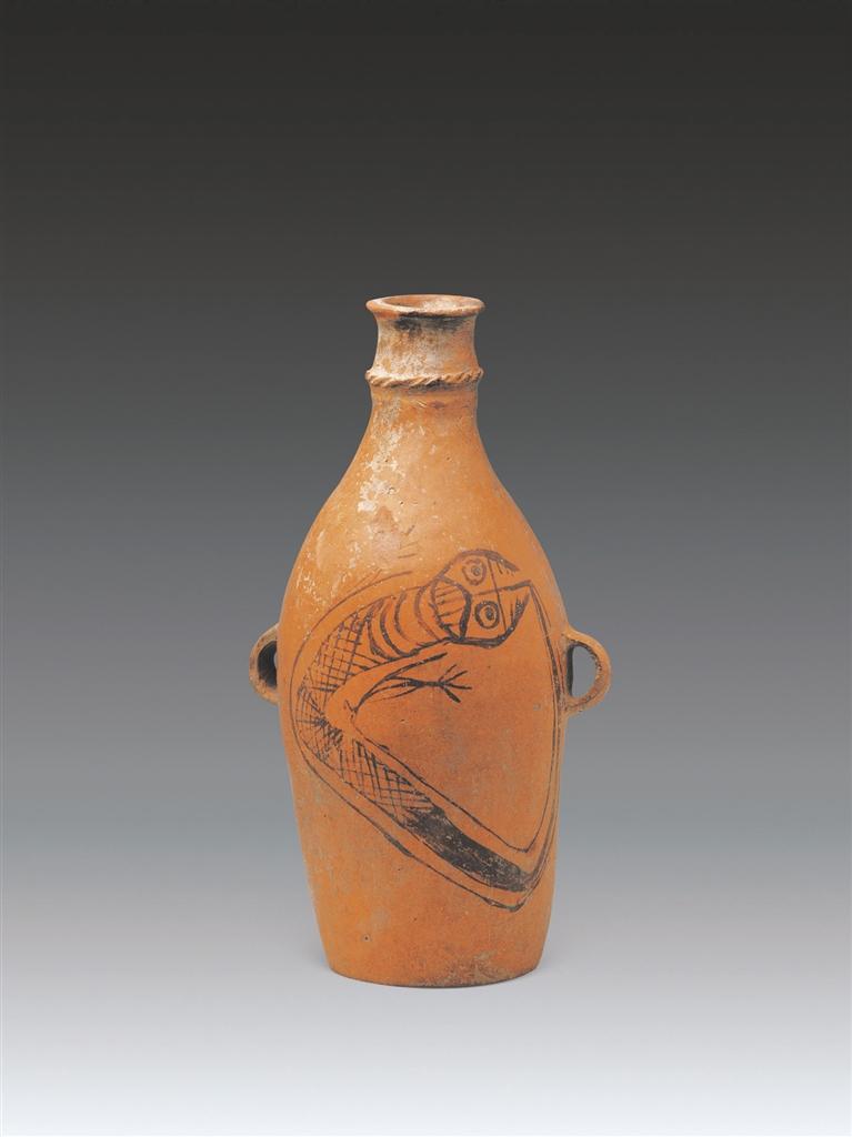彩陶鲵鱼纹瓶是新石器时代仰韶文化石岭下类型陶器,别称“陶二妮”,1958年出土于甘肃省甘谷县西坪遗址。该瓶为泥质橙黄陶质,高38厘米,口径6.8厘米,造型为小口、长颈、平底,颈部饰一周附加堆纹,腹部两侧设对称双耳。瓶腹图案中鲵鱼面部呈人形特征,双目圆睁,口部张开露齿,身着斜格纹饰,尾部弯曲与头部相接,肢体末端有四指。瓶身属仰韶文化向马家窑文化过渡类型,年代约为公元前3800~前3300年。