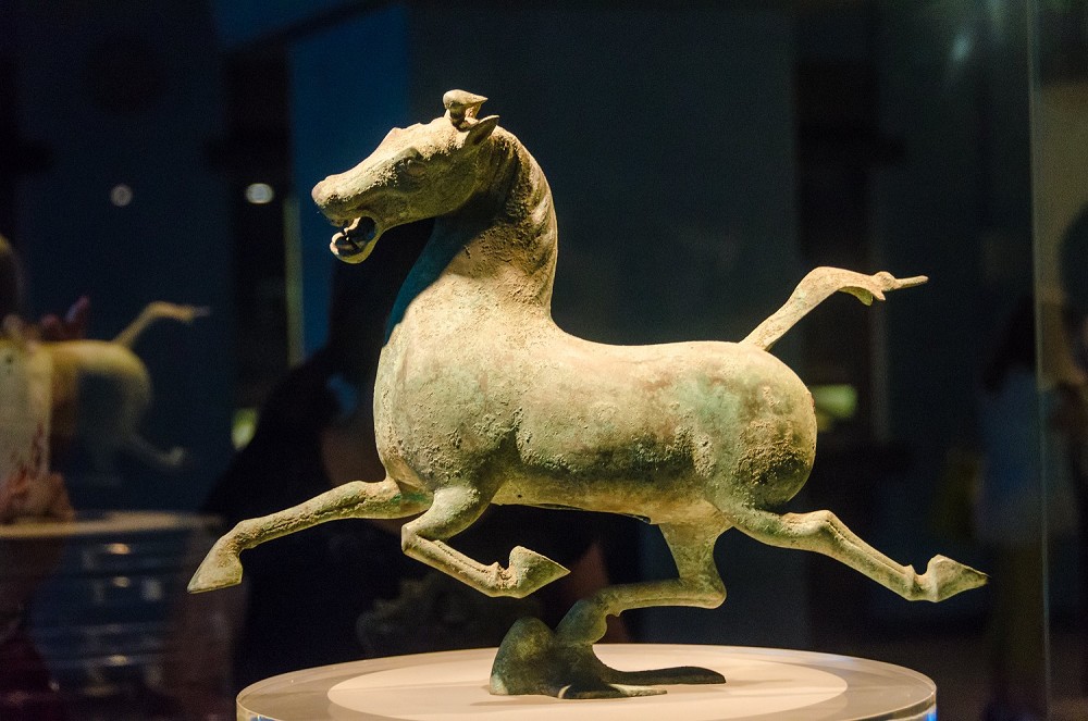 铜奔马,又名马踏飞燕、马超龙雀等,为东汉青铜器,国宝级文物,1969年10月出土于甘肃省武威市雷台汉墓。铜奔马通高34.5厘米,长45厘米,宽13.1厘米,重7.3千克,造型矫健精美,作昂首嘶鸣,疾足奔驰状,显示了一种勇往直前的豪情壮志。奔马三足腾空、一足超掠飞鸟的瞬间,飞鸟回首惊顾,更增强奔马急速向前的动势,全身的着力点集注于超越飞鸟的一足之上,准确地掌握了力学的平衡原理,具有卓越的工艺技术水平。