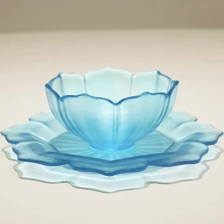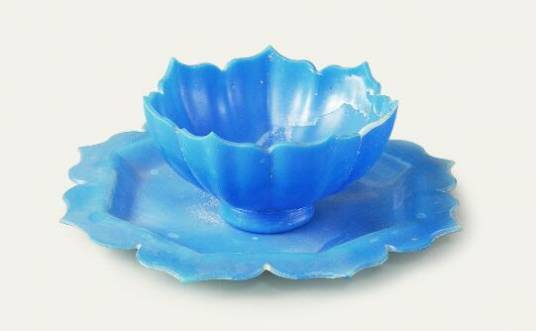 莲花形玻璃托盏为元代文物,1999年出土于定西市漳县汪世显家族墓(墓主汪惟贤为元代荣禄大夫、大司徒),属国宝级文物。该器由普蓝色半透明玻璃制成,胎内含气泡,由盏与托组成:盏高4.9厘米,口径8.9厘米,底径3.4厘米,呈七瓣莲花形,配饼形足;托高1.2厘米,口径15.2厘米,托口平口,腹壁正八角形,外沿八瓣莲花形,平底。整套器物造型华美,工艺精湛,为迄今出土最完整的元代玻璃托盏,反映元代官办手工业发展水平。