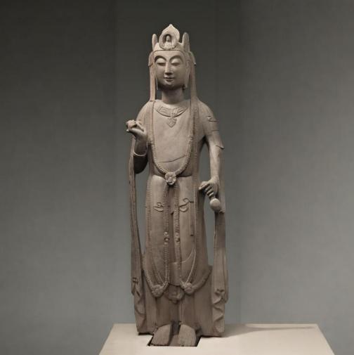 石观音菩萨立像是甘肃省博物馆收藏的国家一级文物,为隋代单体观音造像代表作品。该像出土于秦安县,通高132厘米,头戴饰有阿弥陀佛像的四瓣花冠,面部圆润慈祥,身披络腋佩宽边项圈,右手曲肘持莲蕾的造型成为当代文创设计的重要灵感来源。其洗练的雕刻技法和完整的单体形制,印证了北周至隋代中国佛教雕塑艺术的发展特征。