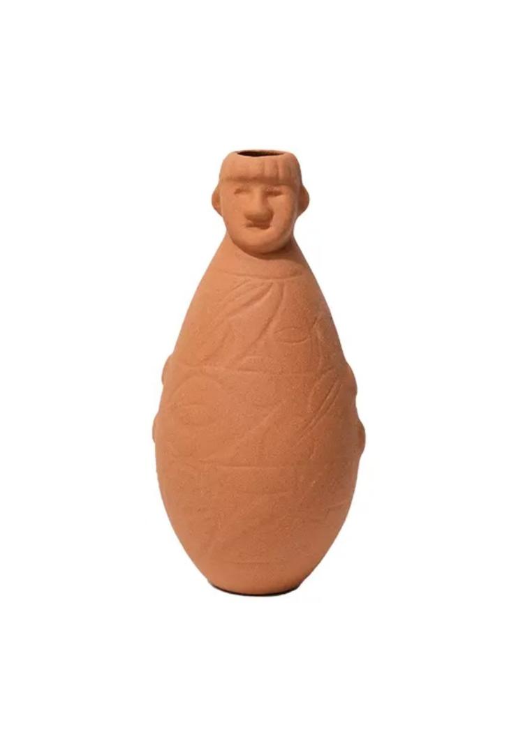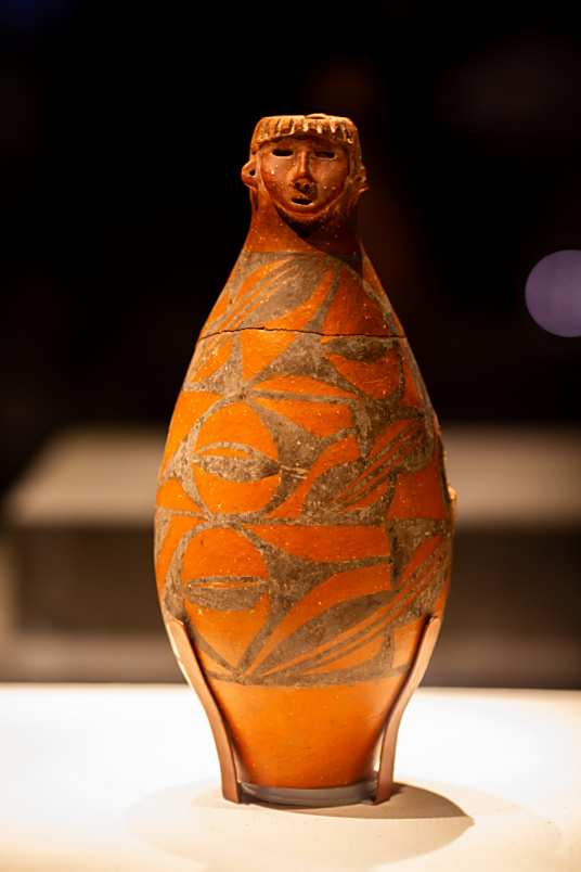 人头形器口彩陶瓶是甘肃省博物馆的镇馆之宝,它1973年出土于甘肃秦安大地湾遗址,是大地湾遗址出土的上千件陶器中唯一一件塑有人像的葫芦形彩陶瓶(截至2021年)。人头形器口彩陶瓶距今已有5500多年的历史。其高32.3厘米,口径4厘米,底径6.8厘米,其材质为细泥红陶,含有少量的白色细砂;它挺鼻小嘴,五官端正,齐刘海造型,双耳还有系挂饰物的小口;瓶身绘有黑彩纹饰,精雕的彩陶纹饰圆弧纹与变体鸟纹。陶瓶头部上方有圆形开口,其用途应是盛水器或者祭祀用品。