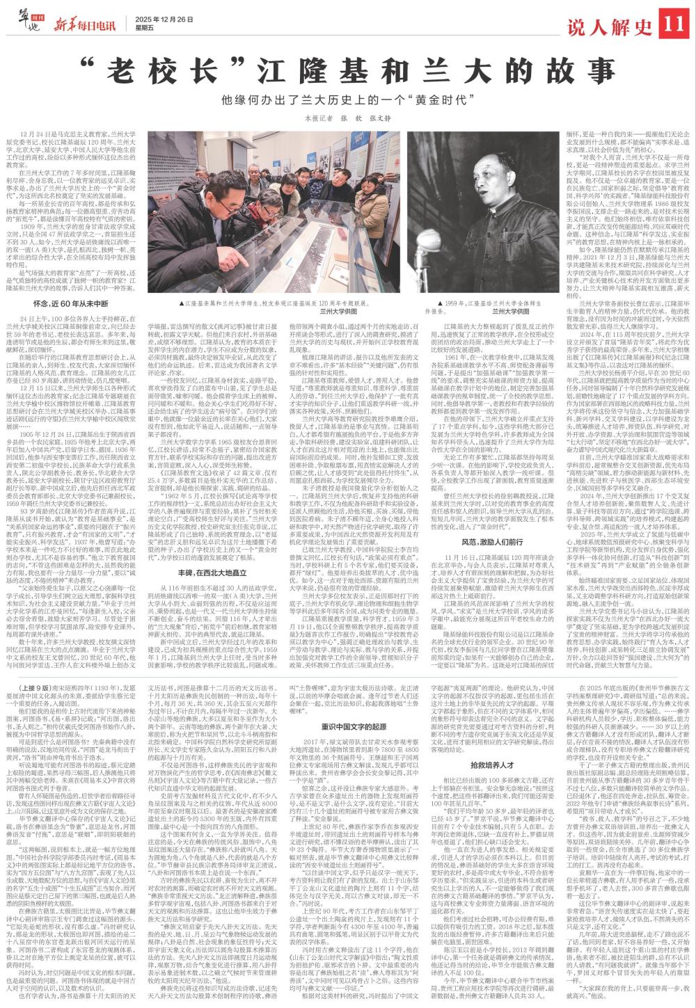 从116年前招生不超过30人的法政学堂,到胡焕庸线以西唯一的双一流(A类)大学,兰州大学从小到大、由弱到强的历程,不仅是应运而兴、乘势而起,也是一代又一代兰州大学师生持续不断创业、奋斗的结果。回望116年,人才辈出的“兰大现象”背后,“拓荒牛”前后相继,教育家精神薪火相传。其中的典型代表,就是江隆基。