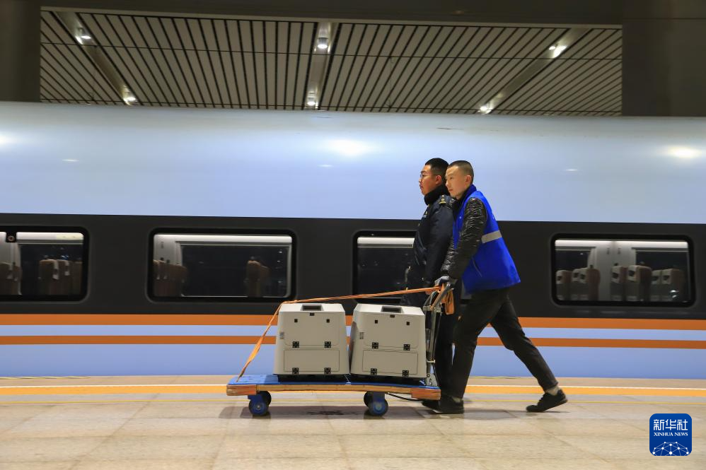 2月1日,在兰州西站站台上,中铁快运兰州西站营业部工作人员马俊高(右)和孙谦准备将旅客托运的宠物送上高铁列车。新华社发(王光辉 摄)