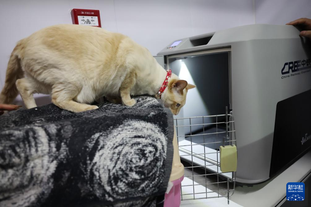 2月1日,在中铁快运兰州西站营业部宠物交接区,一只小猫准备进入高铁宠物运输专用箱。新华社记者 陈斌 摄