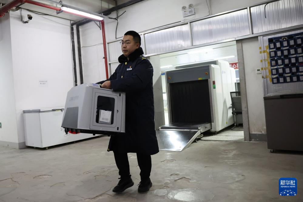 2月1日,中铁快运兰州西站营业部工作人员孙谦在检查高铁宠物运输专用箱。新华社记者 陈斌 摄