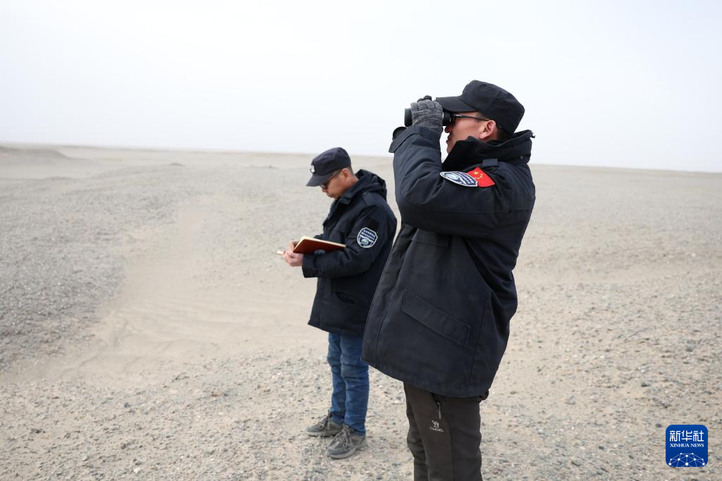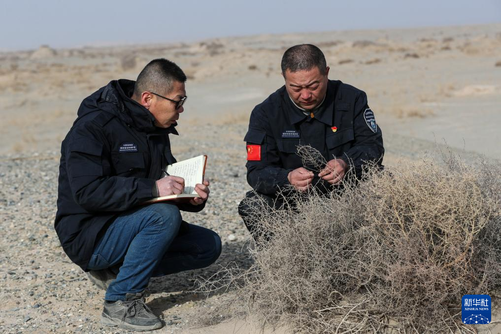 2月5日,甘肃敦煌西湖国家级自然保护区管护中心玉门关保护站站长吴兴东(右)和同事肖永刚在保护区内观察记录植被生长情况。新华社记者 郎兵兵 摄