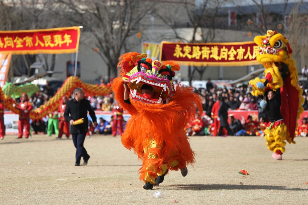 3月3日,社火队员在甘肃省定西市安定区大操场表演舞狮。 新华社发(王克贤 摄)
