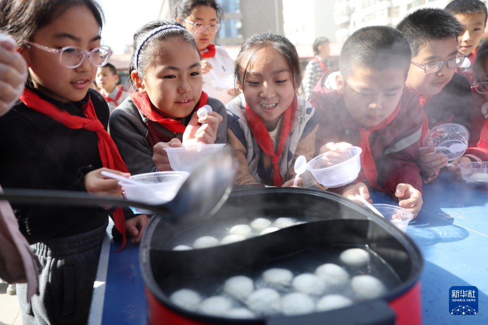 3月3日,甘肃省兰州市东郊学校的学生在校园元宵节民俗活动上煮元宵。新华社记者 陈斌 摄