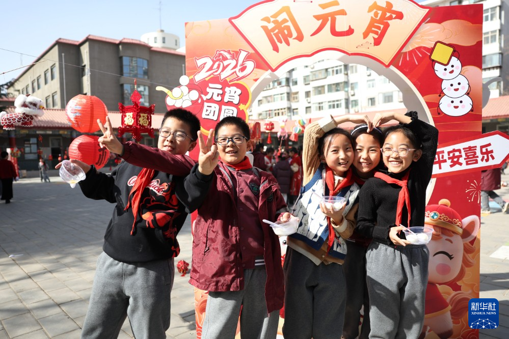 3月3日,甘肃省兰州市东郊学校的学生在校园元宵节民俗活动上合影留念。新华社记者 陈斌 摄