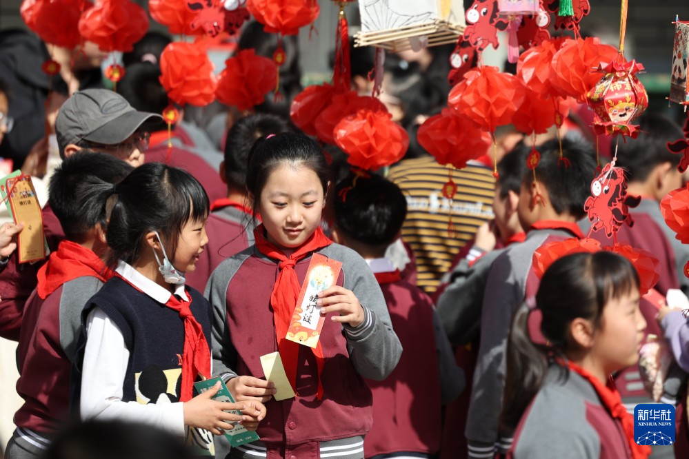 3月3日,甘肃省兰州市东郊学校的学生在校园元宵节民俗活动上猜灯谜。新华社记者 陈斌 摄