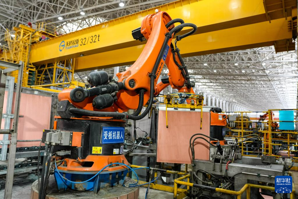 4月14日,在金川集团永昌铜业有限公司精炼分厂,受板机器人在进行剥片作业。新华社记者 郎兵兵 摄